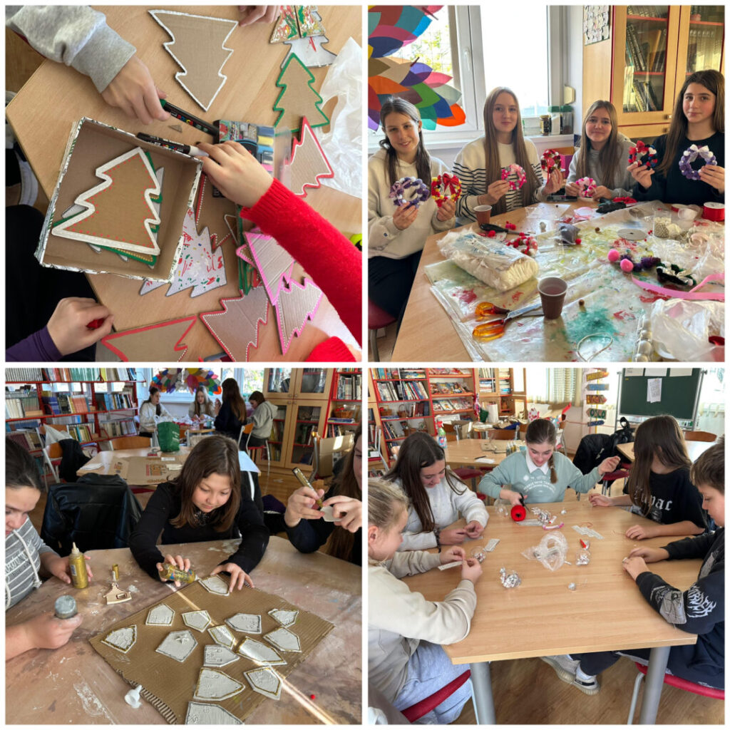 Božićni duh polako se tijekom prosinca spustio u našu školu. Ukrašavale su se učionice, prozori, vrata,… okitili smo bor, ukrasili jaslice i počeli s božićnim radionicama za naš humanitarni božićni sajam.