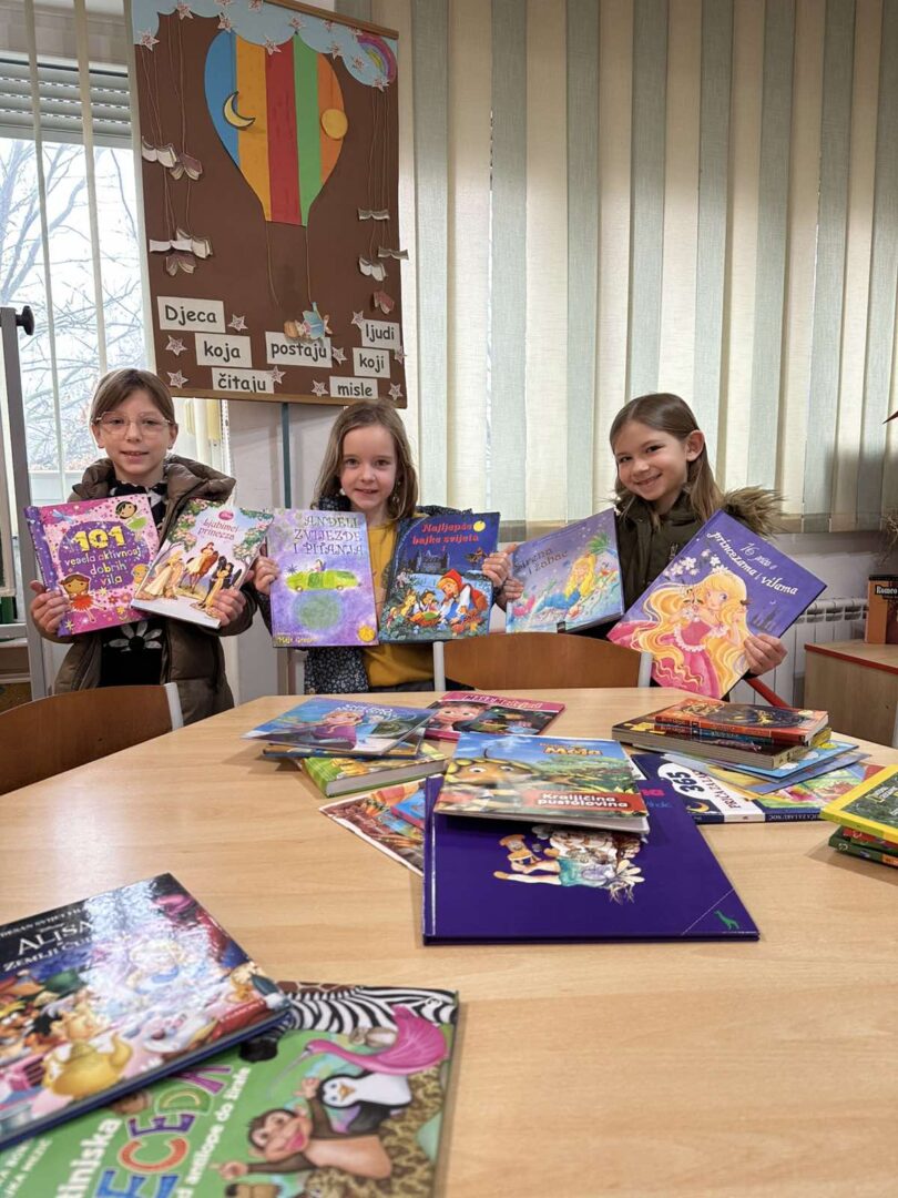 Tako je i naša knjižničarka Darinka Vučković uključila školu u akciju darivanja knjiga i slikovnica koju provodi i Odjel za djecu i mladež Gradske knjižnice „Ivan Goran Kovačić“. Predstavnice naše škole, učenice 2. a razreda Elena, Noa i Stela, danas su u pratnji knjižničarke i ravnateljice posjetile knjižnicu. Donijele su prikupljene knjige i odaslale poruku – uključite se u ovu akciju, darujte knjige i nekoga razveselite, čitanje je važno i zabavno.