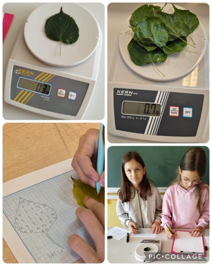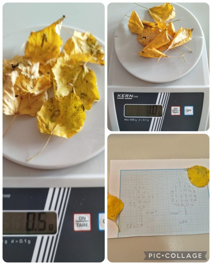 Pomoću milimetarskog papira određivali su i uspoređivali površinu listova breze i lipe. Također su vagali svježe i osušene listove i određivali prosječnu masu lišća. Iz dobivenih podataka izračunali su prosječnu količinu ugljika koje stablo pohrani u lišću. Mjerenja su ponovili kada je lišće breze i lipe promijenilo boju.