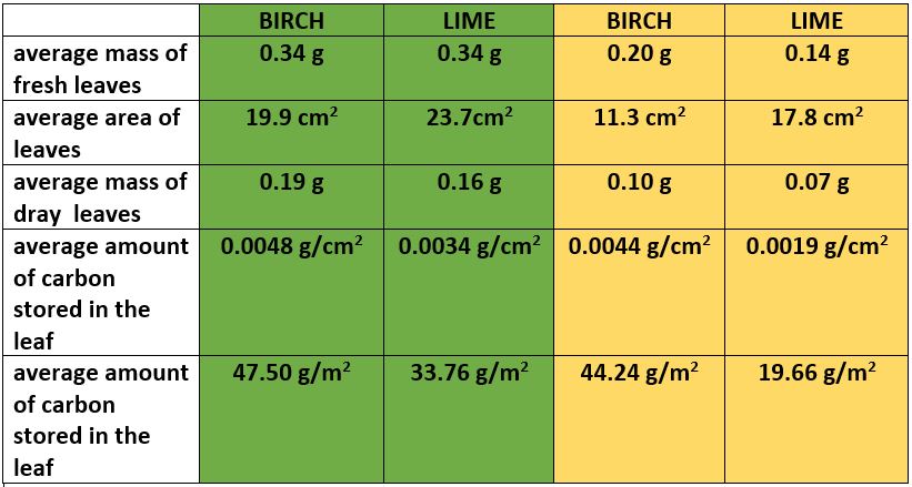 Zaključili su da listovi lipe imaju veću prosječnu površinu i prosječnu masu. Stablo breze je recikliralo iz lišća i pohranilo za zimu veću prosječnu masu ugljika po m2.