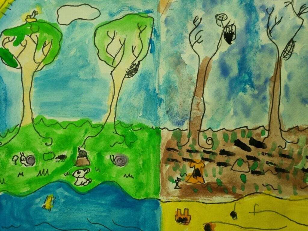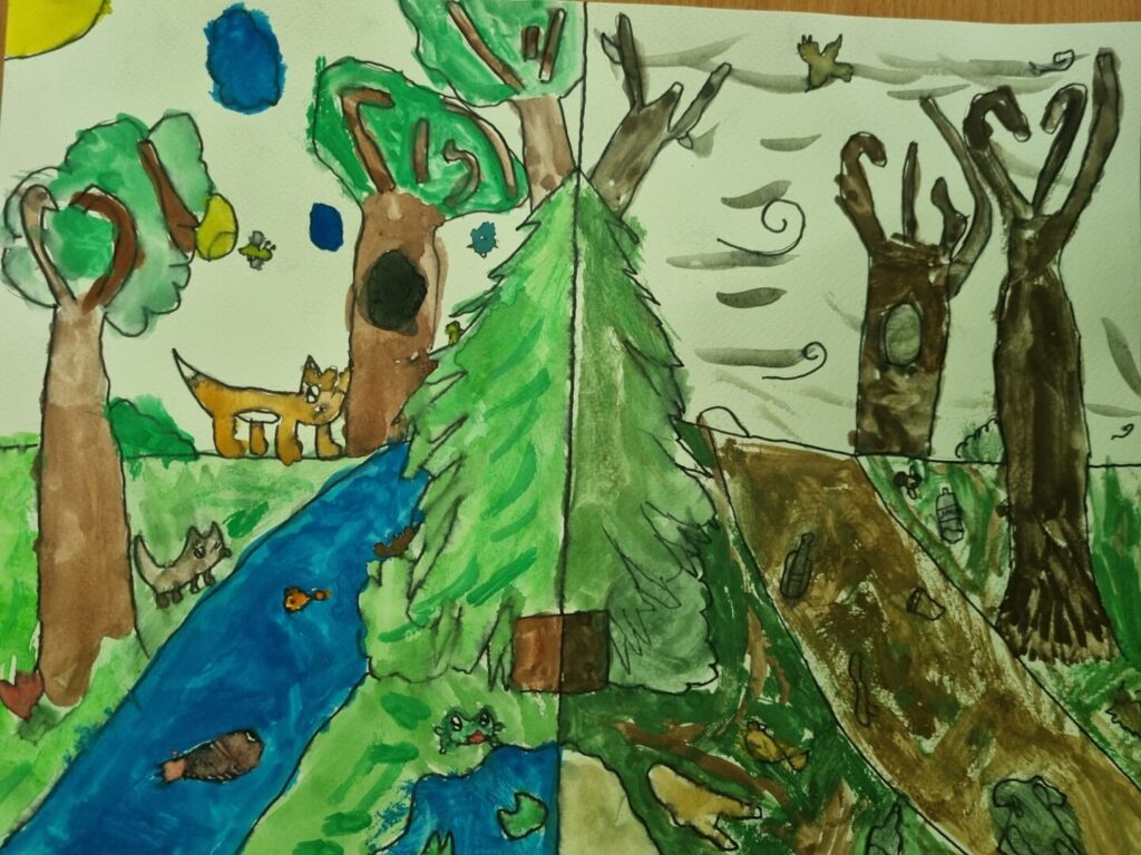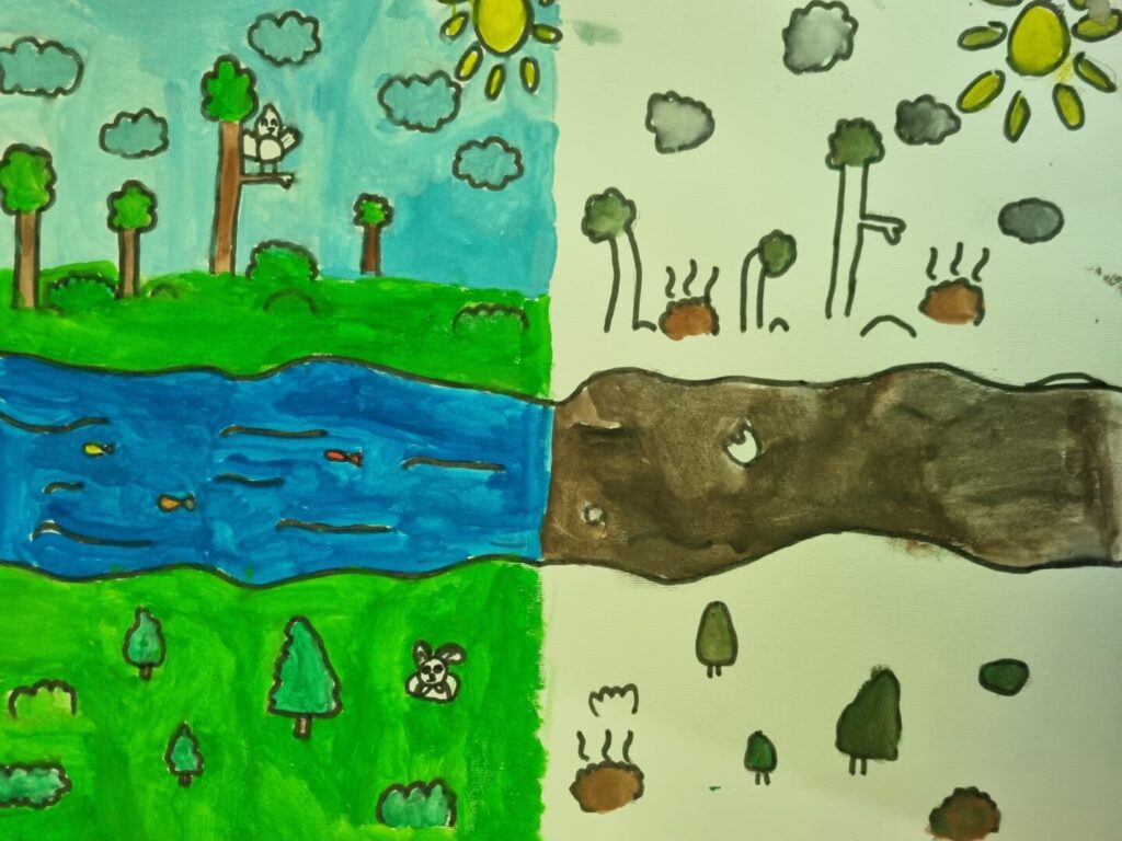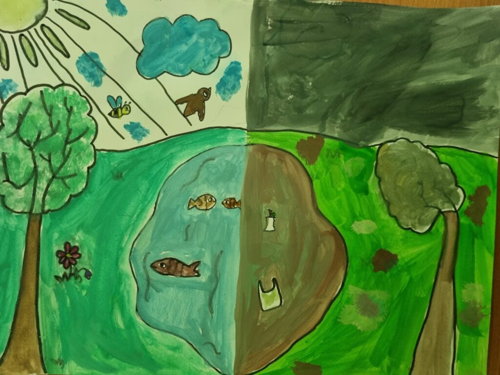 Učenici 3.c likovno su se izrazili na temu Čuvajmo okoliš prikazujući kontrast prirodne ljepote i ekološke štete koju uzrokuje čovjek.