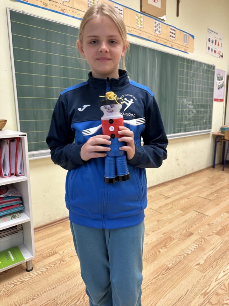 Na kraju sata učenici su svoju kreativnost pokazali osmišljavanjem eko‑junaka koji spašava svijet od e‑otpada. Izradili su svog junaka od starih tipki s tipkovnice, dali mu ime i posebnu supermoć te kratko predstavili kako njihov junak pomaže planetu. Aktivnost je potaknula razvoj digitalnih vještina, kreativnost i osvještavanje važnosti odgovornog odnosa prema tehnologiji i okolišu.