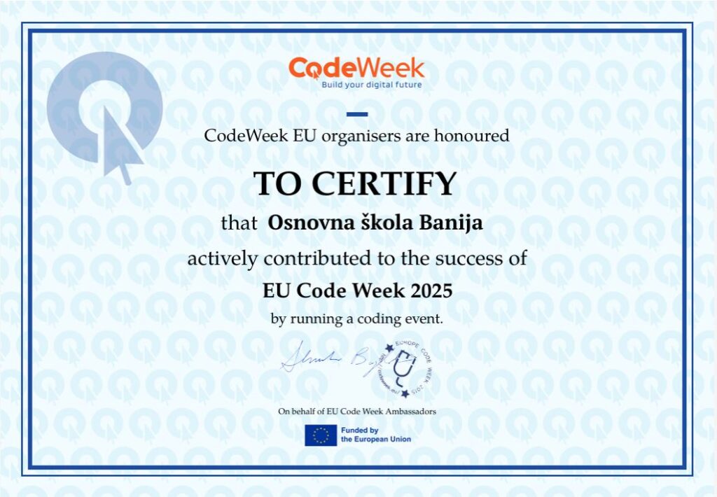 Za aktivno sudjelovanje i uspješnu organizaciju radionica naša škola je i ove godine dobila službeni certifikat Europskog tjedna programiranja.